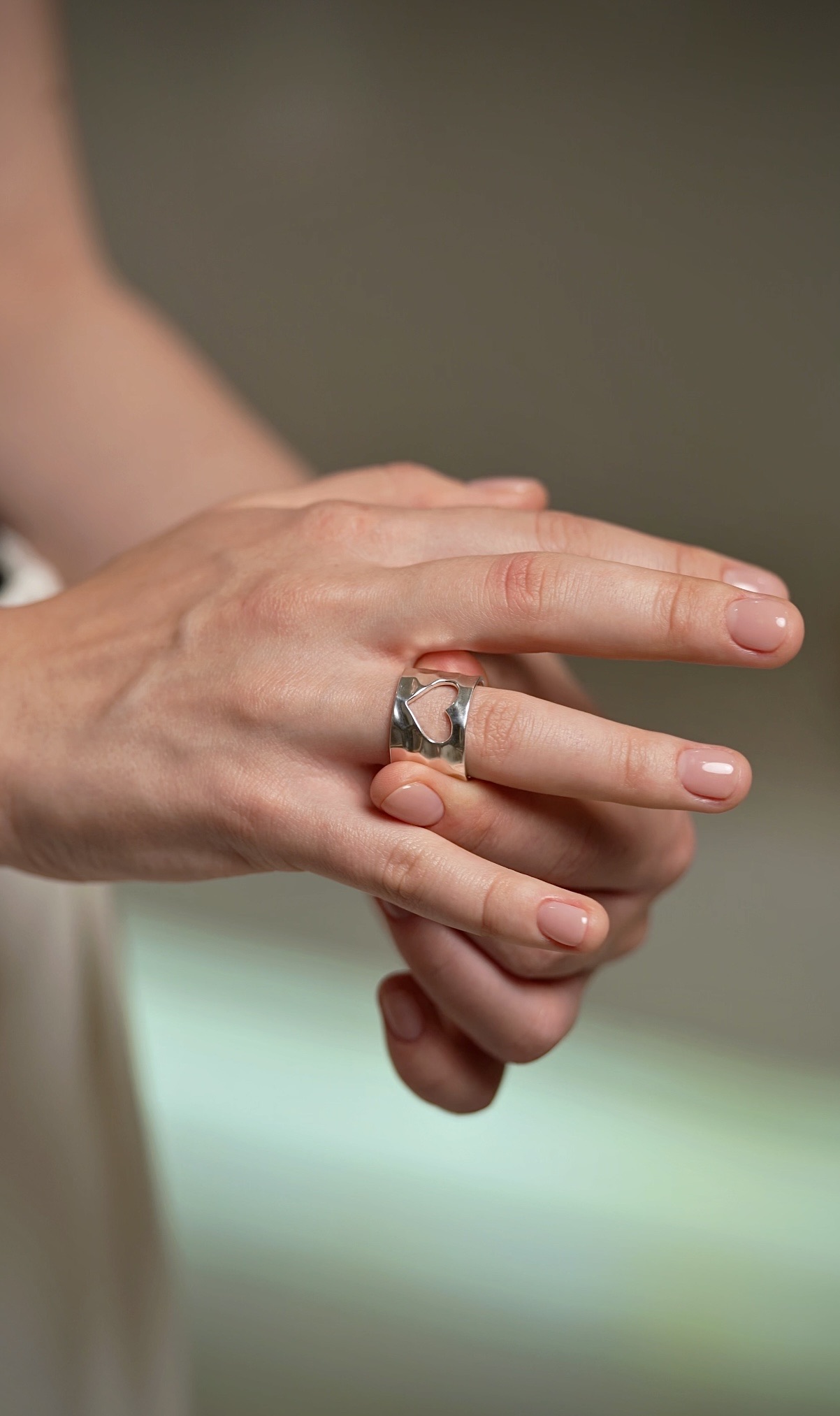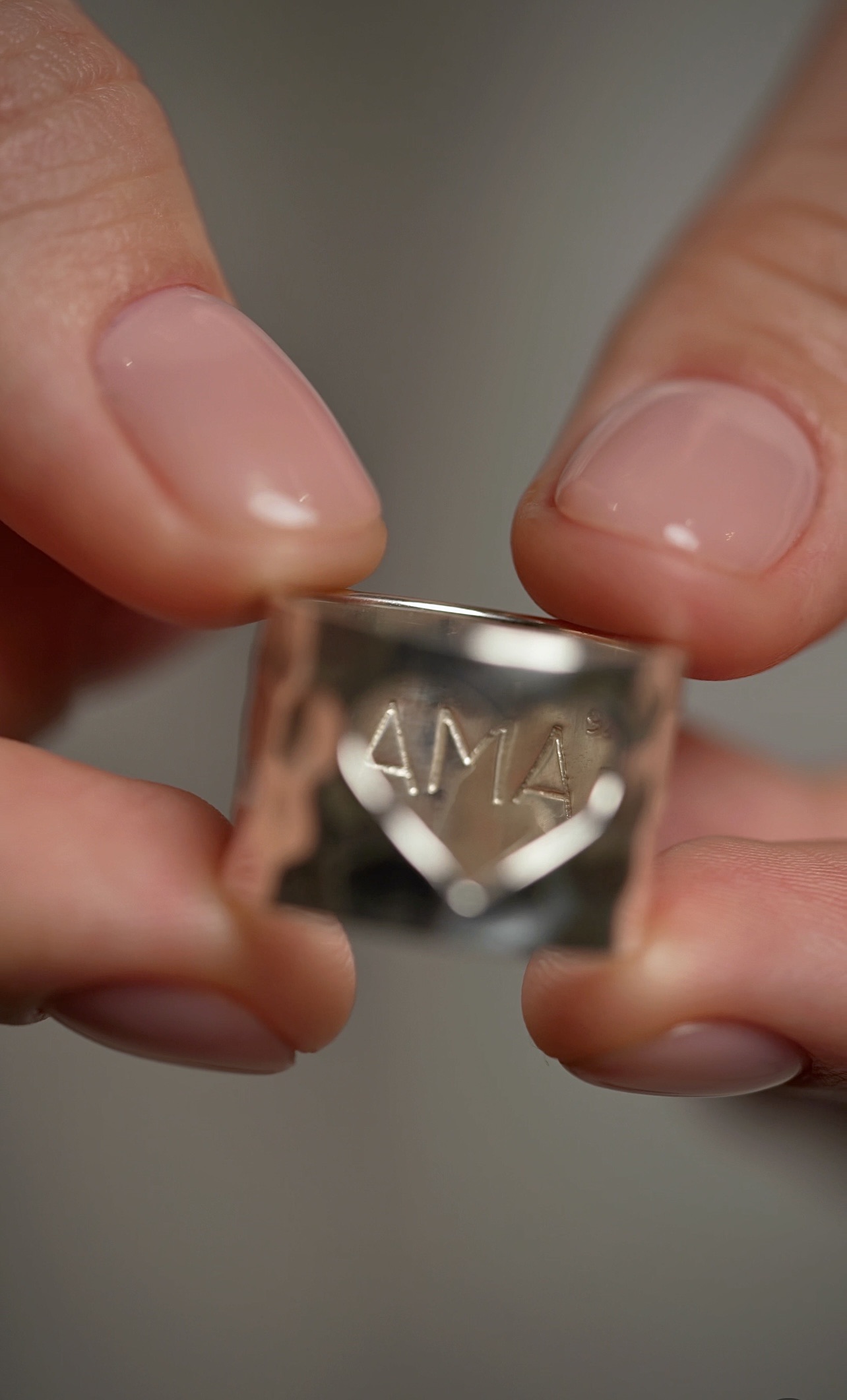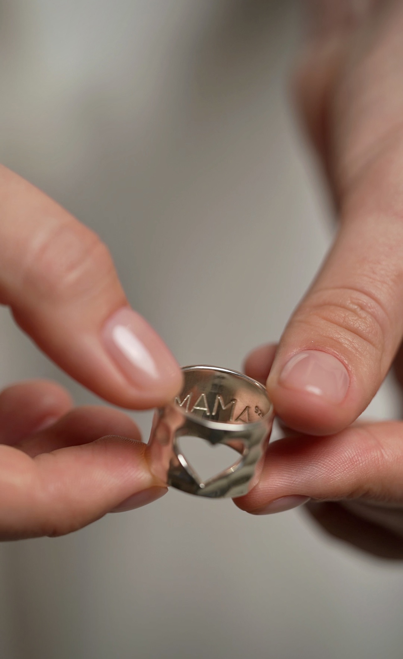 Минималистичное кольцо, подходящее к любому образу. Но стоит присмотреться - и вы увидите аккуратно вырезанное окошко в виде сердца. А через него — гравировку со словом «Мама» .